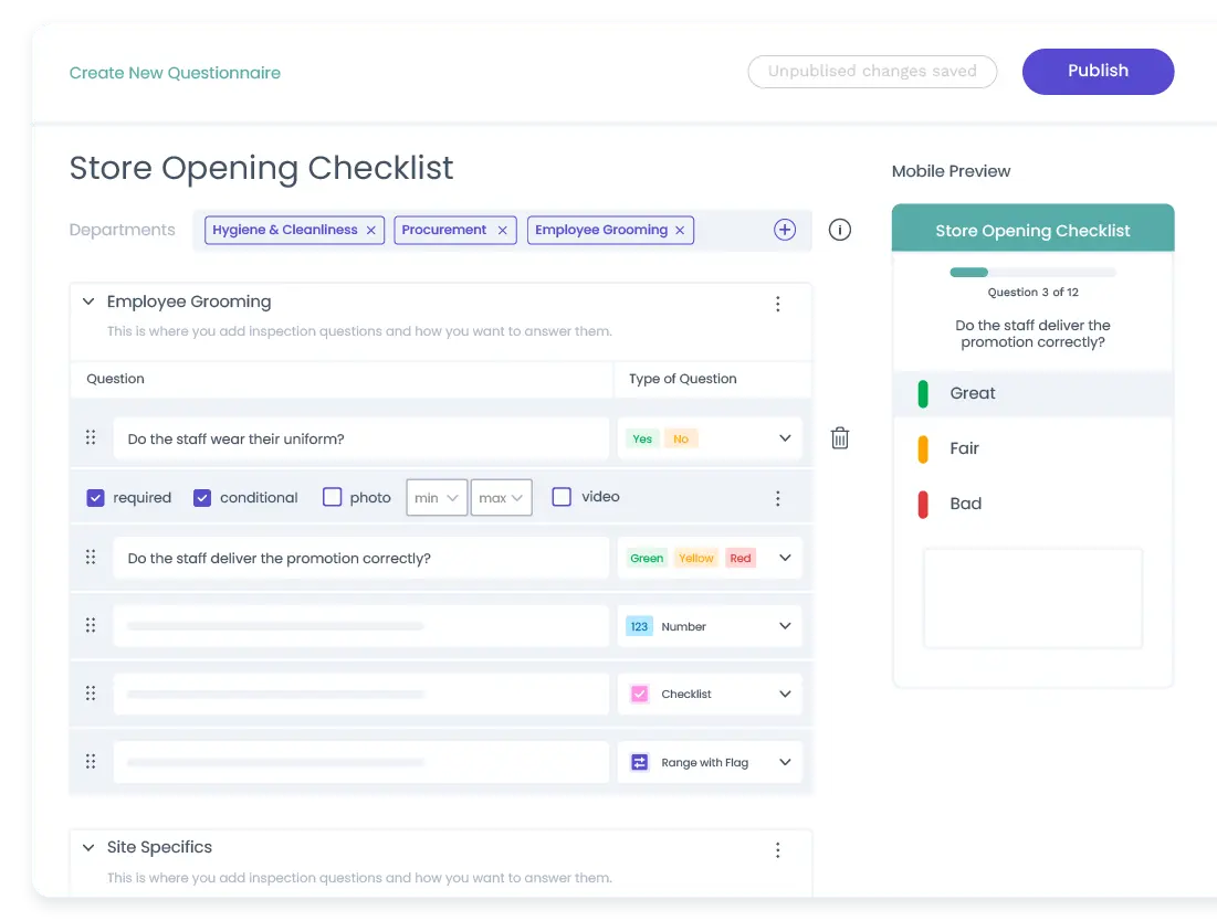 Say goodbye to tedious questionnaire building with Nimbly's intuitive and efficient builder. Create high-quality questionnaires with ease using our comprehensive range of question types, from simple Yes/No options to more detailed Range with Flags.
